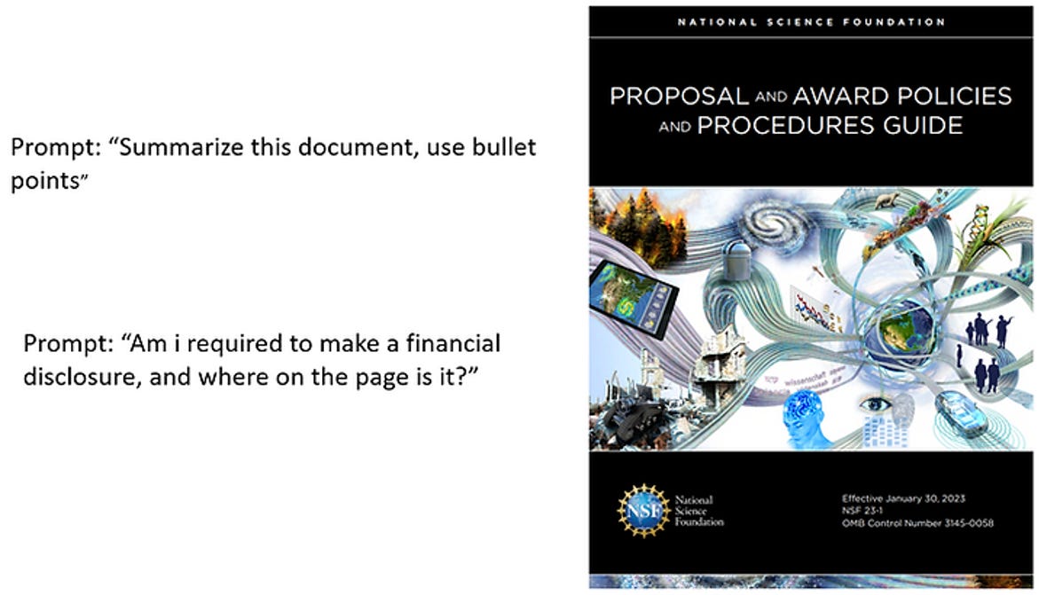 >>Response: “This document is the Proposal and Award Policies and Procedures Guide (PAPPG) from the National Science Foundation (NSF). It provides guidance for preparing and submitting proposals to NSF and for managing and monitoring NSF awards. Some of the main points of this document are:
