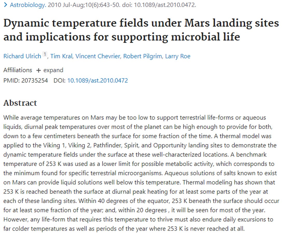 >>Response: “The article is about how the temperature on Mars changes during the day and the year at different places where spacecraft have landed. The authors used a computer model to calculate the temperature under the surface of Mars at these places. They wanted to see if the temperature could be warm enough for some kinds of life to survive. They used 253 K (about -20 degrees C) as a minimum temperature for life, because some microbes on Earth can live at that temperature. They also considered that some salts on Mars can make water stay liquid at lower temperatures. They found that 253 K is reached under the surface at some times of the year at all the landing sites, and most of the year near the equator. However, the temperature also drops very low at night and during winter, so any life would have to endure these changes. The authors suggest that this could be possible for some microbes that can go dormant when it is too cold or dry.”