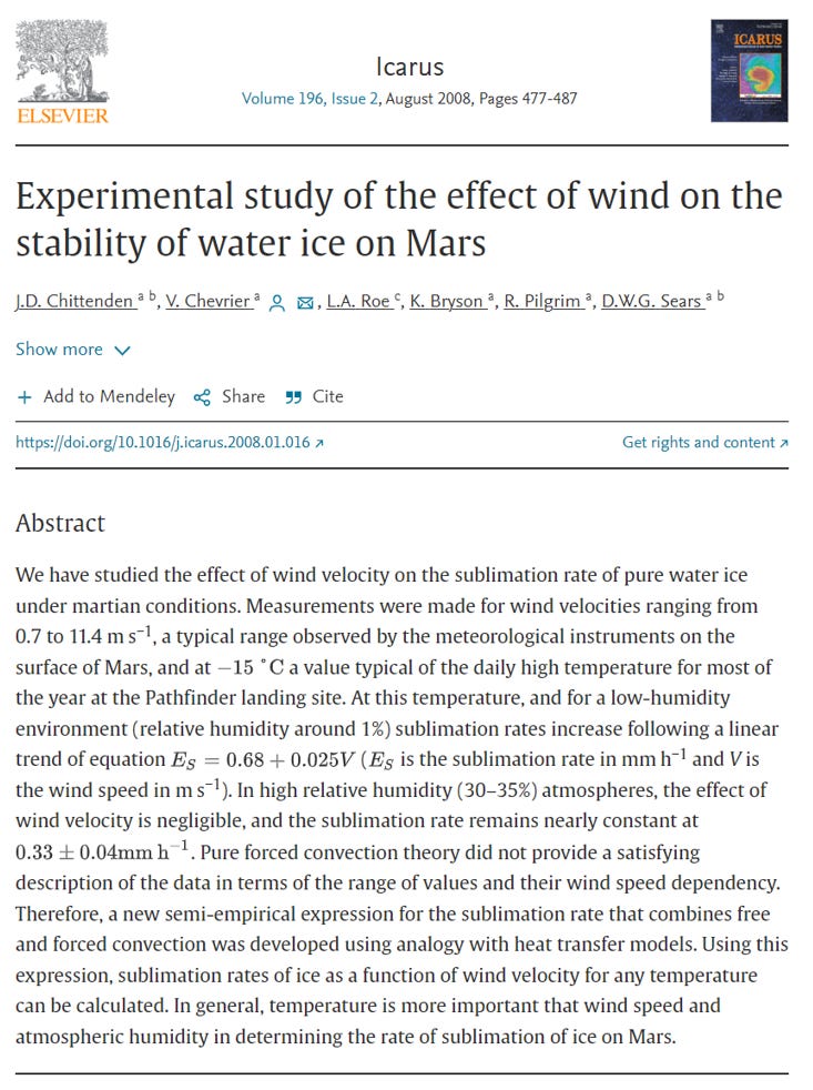 >>Response: “The article is about an experiment that studied how fast water ice disappears on Mars. Water ice is important for understanding the history and the possibility of life on Mars. The experiment measured how fast water ice turns into water vapor under different conditions of temperature, wind speed and humidity. Temperature is how hot or cold something is, wind speed is how fast the air moves and humidity is how much water vapor is in the air. The experiment found that temperature is the most important factor that affects how fast water ice disappears on Mars. Wind speed also has some effect, but only when the humidity is very low. The experiment also developed a new formula that can be used to calculate how fast water ice disappears on Mars for any temperature and wind speed. The article explains why this formula is better than previous ones and how it can help future studies of water ice on Mars.”